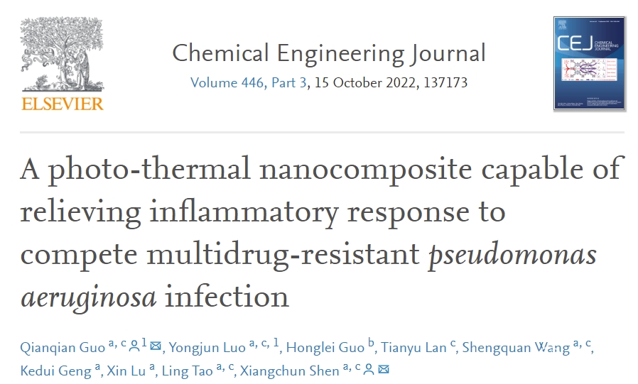 5月31日,k1体育郭欠欠副教授、沈祥春教授领衔的团队在国际高水平化学杂志《Chemical Engineering Journal》(中科院分区1区)上发表了题为A Photo-Thermal Nanocomposite Capable of Relieving Inflammatory Response to Compete Multidrug-Resistant Pseudomonas aeruginosa Infection的研究论文,该SCI期刊影响因子为13.27,k1十年体育品牌首次以第一作者单位与第一通讯单位发布。