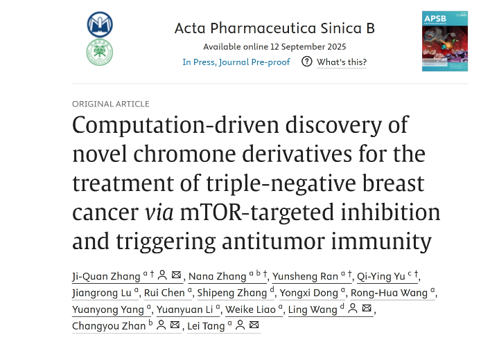 近日,公司中药功效成分发掘与利用全国重点实验室/贵州省化学合成药物研发利用工程技术研究中心汤磊/张吉泉教授团队在药学学科顶尖期刊《Acta Pharmaceutical Sinica B》(中科院一区TOP期刊,影响因子14.6)上发表研究论文《Computation-driven discovery of novel chromone derivatives for the treatment of triple-negative breast cancer via mTOR-targeted inhibition and triggering antitumor immunity》,发现一类新型高效靶向抑制与免疫调控双功能色酮类化合物,强效抑制三阴性乳腺癌(TNBC)进展。