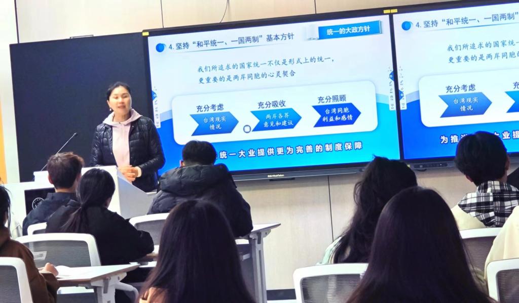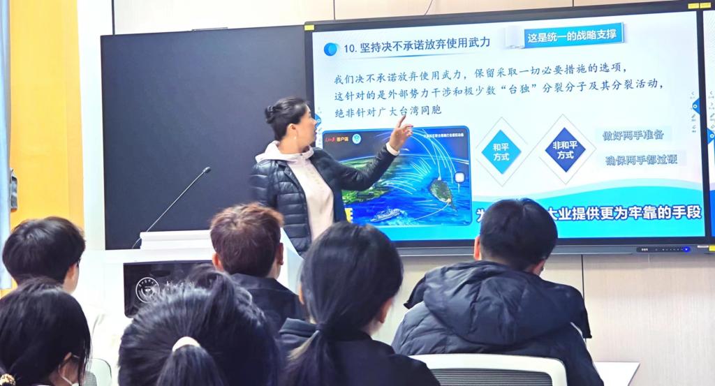 课后,同学们纷纷表示,实现祖国统一是大势所趋,是民心所向,此次授课不仅让同学们加深了对台湾问题的了解和认识,也让大家更加清楚了自己身上所肩负的责任,在今后的学习中,要再接再厉勇攀高峰,以实际行动,为实现中华民族的伟大复兴贡献力量。