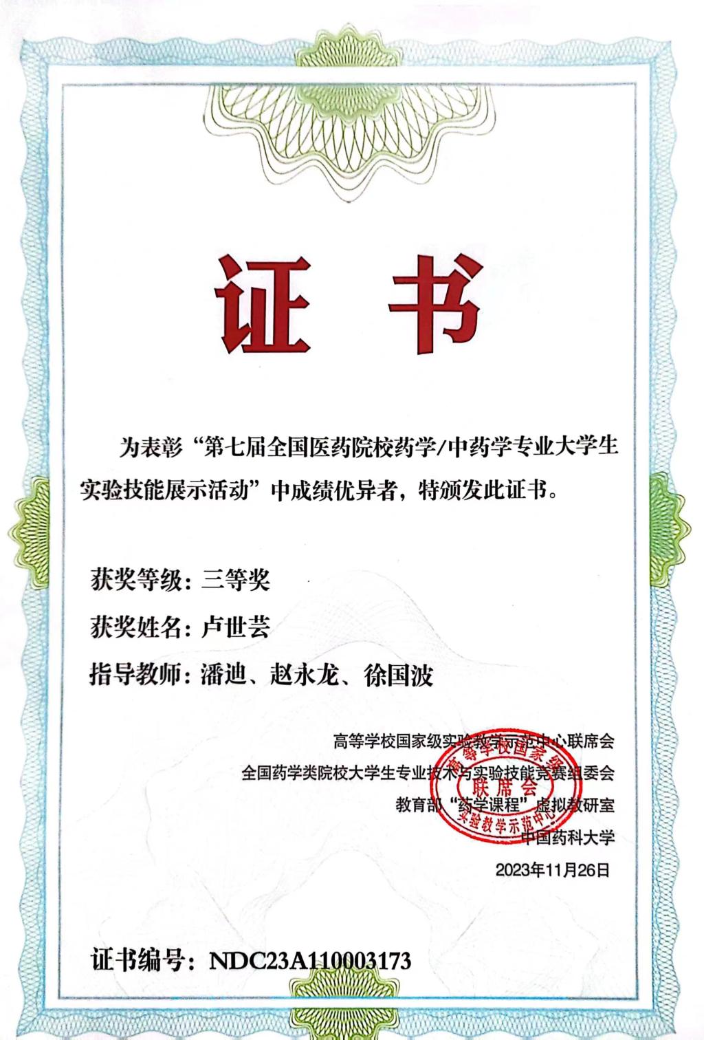 据悉,全国医药院校药学、中药学专业老员工实验技能展示活动自2009年起每两年举办一届,是目前我国高等药学教育领域中规格高、规模大、覆盖面广的专业技能竞赛。本届参赛人数达历史新高,是创办以来规模最大、竞争最激烈的一次。公司员工首次参与该项竞赛,虽然准备比较仓促,但经过指导教师精心指导、备战,两位同学在比赛展示了较好的专业素质,其中来自临床药学专业的卢世芸获得了三等奖。