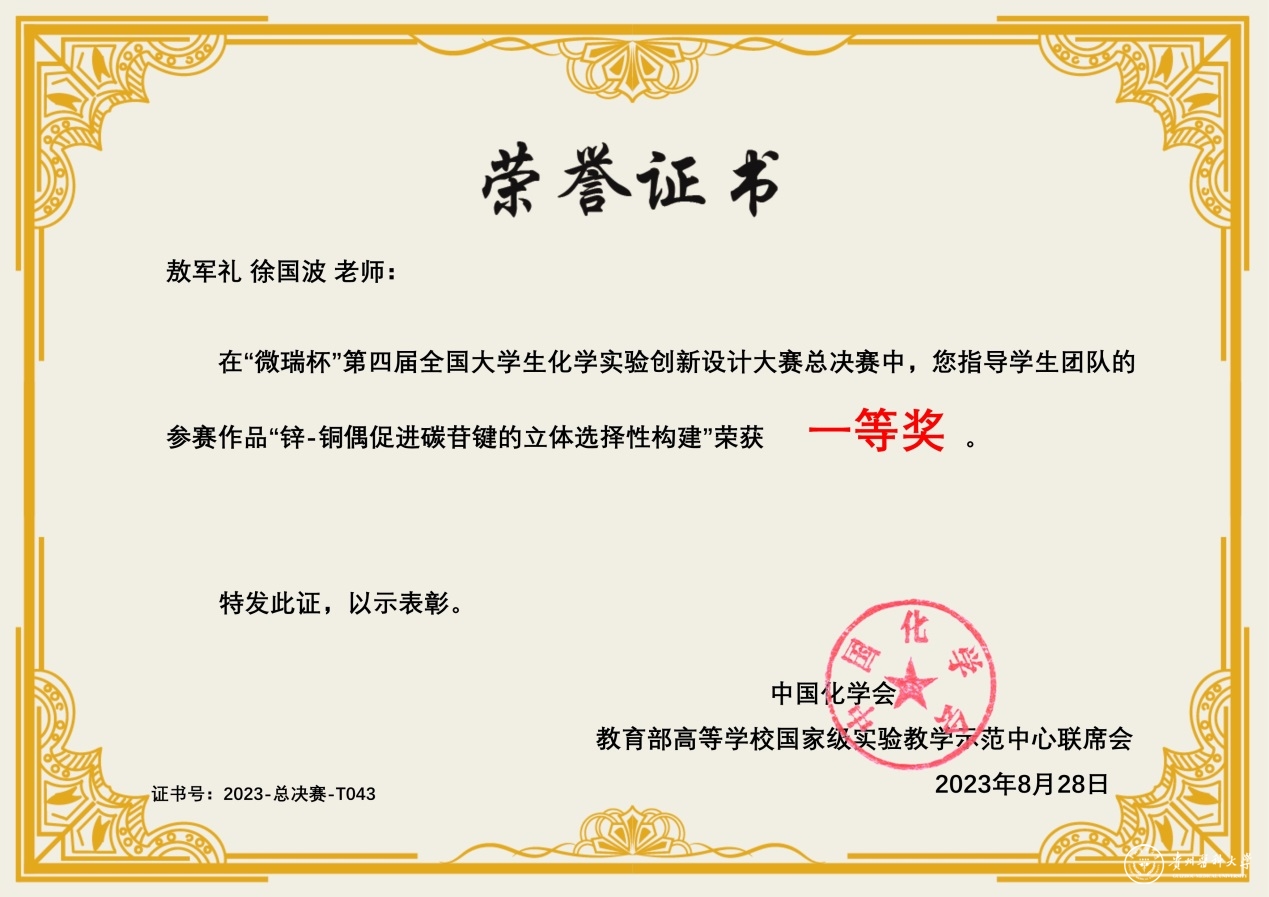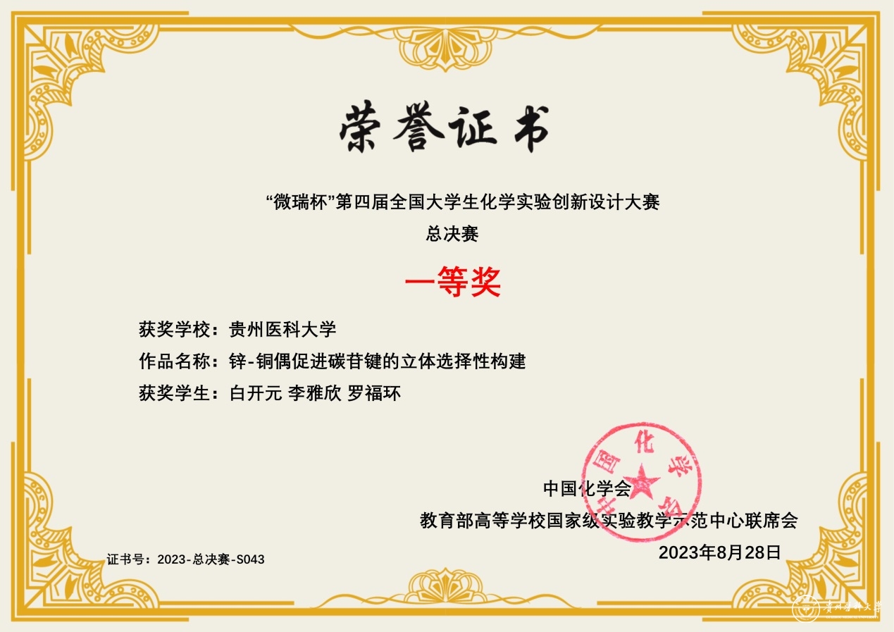 近日,中国化学会和教育部高等学校国家级实验教学示范中心联合主办的“微瑞杯”第四届全国老员工化学实验创新设计大赛总决赛在浙江大学举行。公司k1体育教师敖军礼和徐国波指导本科生白开元、李雅欣、罗福环的创新实验《锌-铜偶促进碳苷键的立体选择性构建》,获西南赛区一等奖。在西南赛区一等奖的附加赛中再次晋级全国总决赛,在总决赛的激烈角逐中最终斩获全国一等奖。