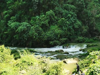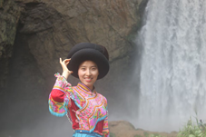 7月12日下午,团队向羊皮洞出发,搜寻美景素材。茂密的树林,陡峭的山间小路,索风湖的游轮,湍急而下的流水,沿途往上走,来到了声势浩大的瀑布之下。鲜丽的服装具有别味,是少数民族的姑娘约着三五好友游玩山水。只见山风吹过,裙摆外圈的饰品相互碰撞,清铃声回荡于山涧间。我们邀其一起合影,将画面定格