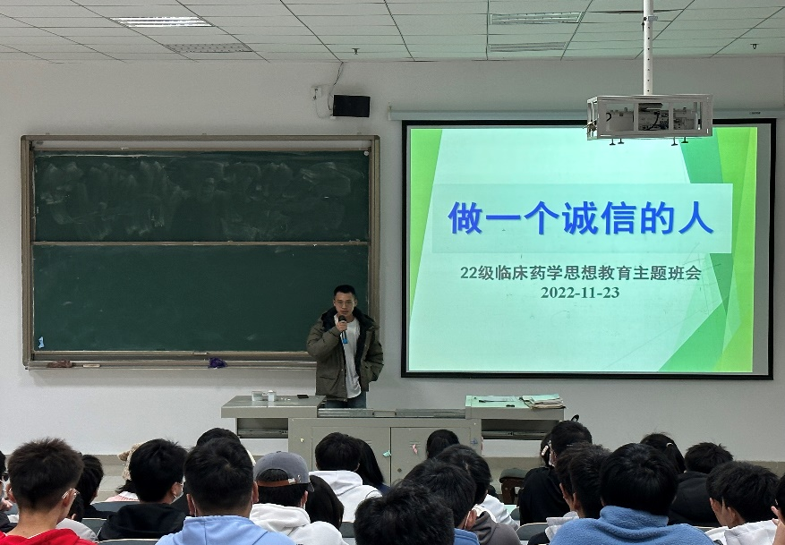 为了让同学们更加全面地了解关于“考试纪律”以及“违纪与作弊的处理办法”。2022年11月23日晚上,22级临床药学班在7503教室开展了“做一个诚信的人”主题班会。由于受疫情影响,此次班会也是班主任与本班同学的第一次正式线下会面。会议由班主任王荣华主持。