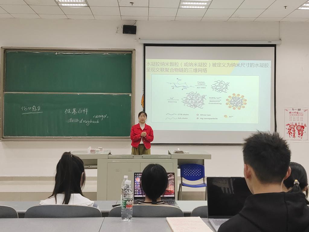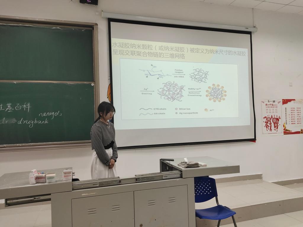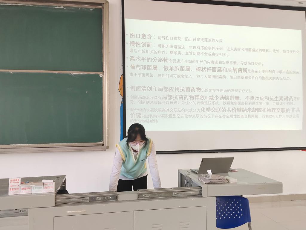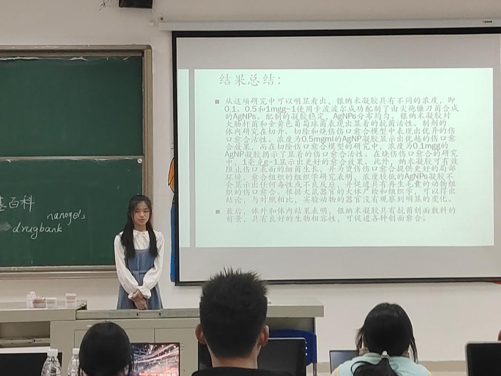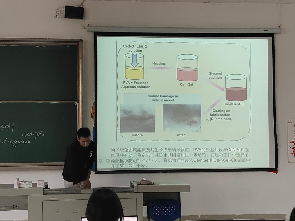 几位代表同学在王玉娥老师的指导下,已完成了一篇SCI科技文献的阅读。现通过员工文献汇报与阅读实践、老师指导的方式开展科技文献阅读训练。同学们检索了关于“nanogels”和“woundhealing”的文献,并阅读了感兴趣的代表文章。四位代表同学分别进行了文献汇报,发现同学们习惯采用网页翻译或翻译软件来阅读英文文献的问题,根据每位同学的文献阅读情况进行指导,王老师强调同学们在阅读英文文献的时候首先做到不依赖翻译软件。科技文献所用语法句式比较简单,对同学们造成阅读障碍的主要是单词或专业词汇,因此要求同学们采用词典翻译解决陌生词汇和专业词汇以阅读英文原文,这样有助于培养同学们的英文阅读语感并积累词汇。