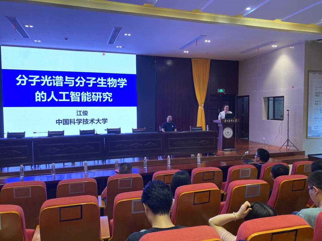 报告期间,江俊教授详细介绍了他们团队在“AI 预测分子光谱机器学习加速量子化学计算以及AI谱学反演机器学习探索隐藏关联性”等方面的最新研究成果,并就AI技术在化学合成路线设计等方面所开展的研究和取得的成就等进行了介绍。