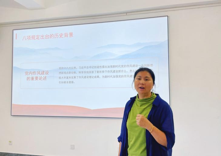 高秀丽从“深入学习领会习近平总书记关于加强党的作风建设的重要论述”、“准确把握违反中央八项规定精神行为的表现形式,动真碰硬靶向整治”、“坚决贯彻落实中央、省委部署要求,高标椎高质量完成深入贯彻中央八项规定精神学习教育各项任务”、“结合本单位实际深入贯彻中央八项规定精神,推动作风建设不断取得新成效”四方面展开讲述。